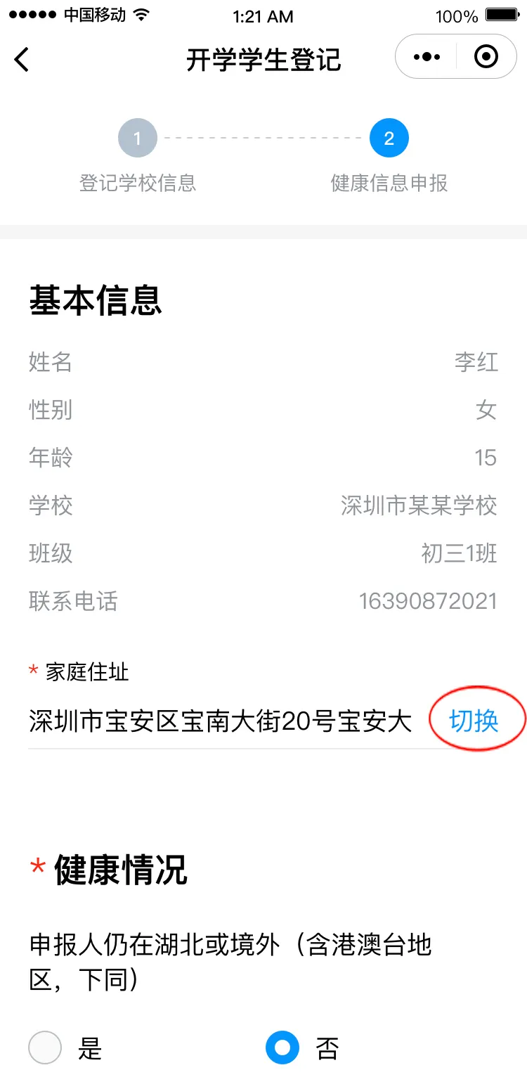 請(qǐng)根據(jù)實(shí)際情況完成健康信息申報(bào),包括選擇家庭住址、申報(bào)健康情況、填寫(xiě)監(jiān)護(hù)人姓名。