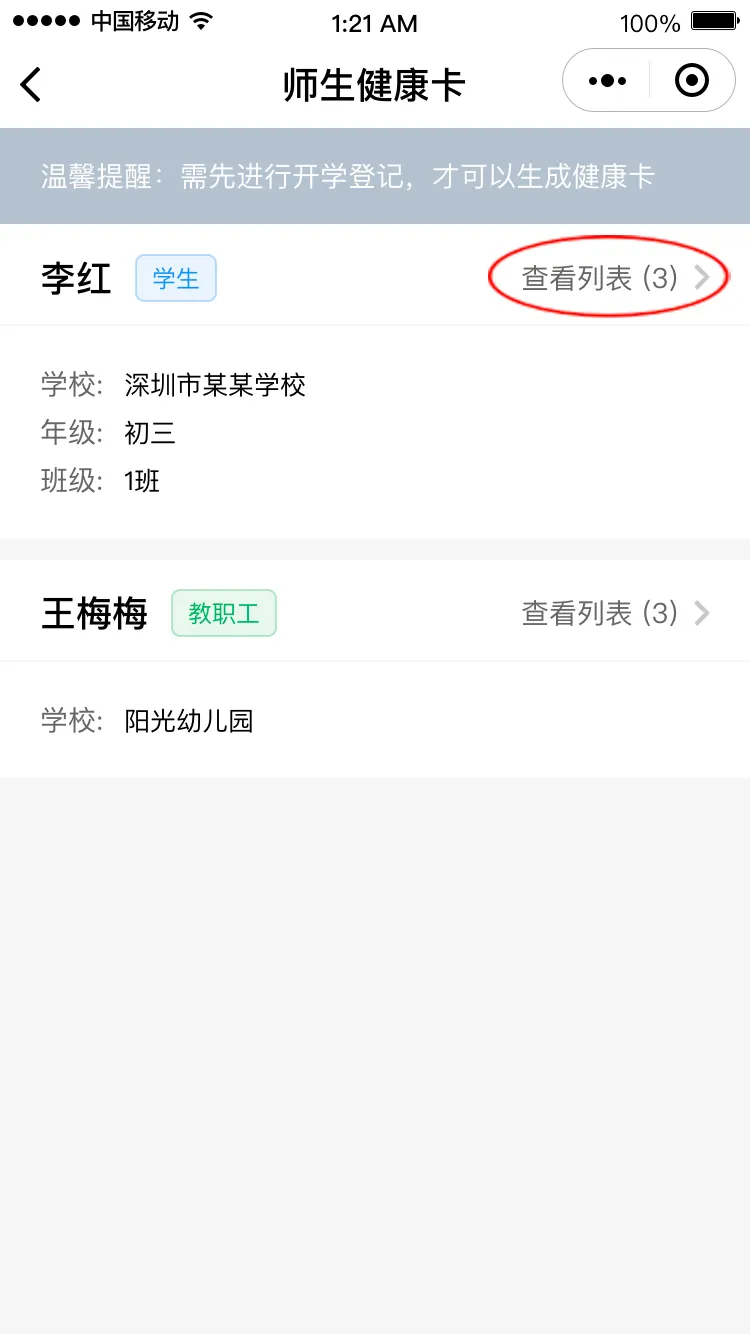 在開(kāi)學(xué)專(zhuān)區(qū),點(diǎn)擊“師生健康卡信息”,進(jìn)入師生健康卡人員列表。