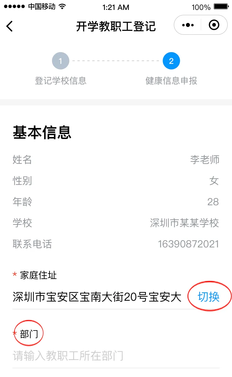 請根據(jù)實(shí)際情況完成健康信息申報(bào),包括選擇家庭住址、填寫所在部門、申報(bào)健康情況。