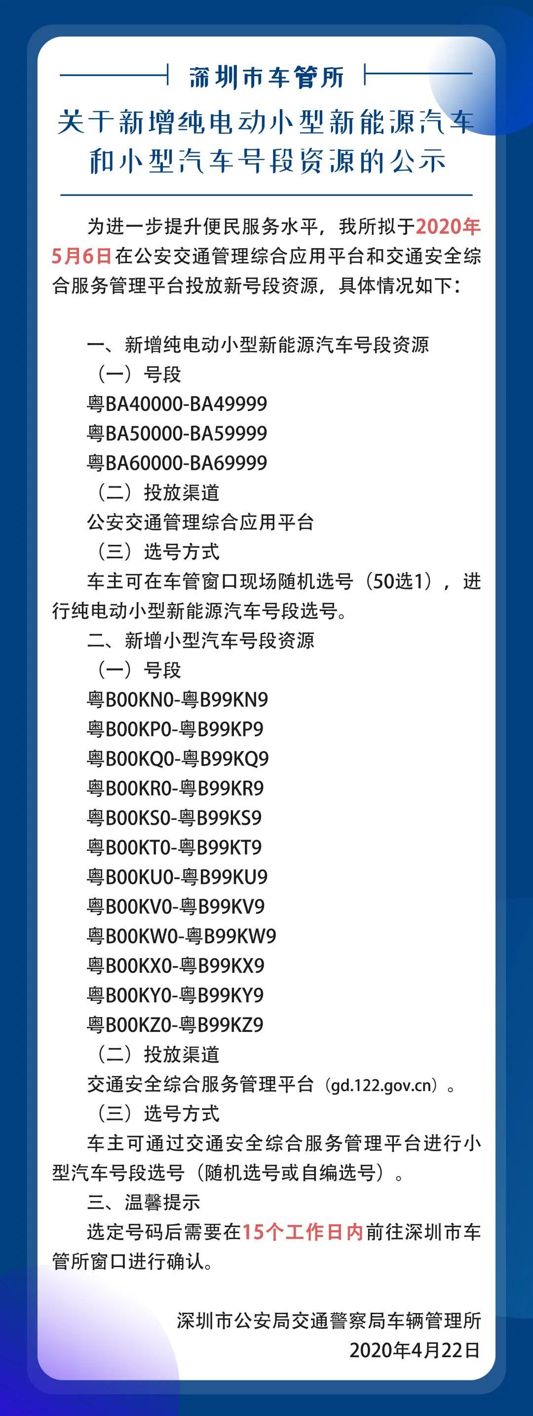 見(jiàn)圳客戶端?深圳新聞網(wǎng)2020年4月23日訊 為進(jìn)一步提升便民服務(wù)水平,深圳市車(chē)管所擬于2020年5月6日在公安交通管理綜合應(yīng)用平臺(tái)和交通安全綜合服務(wù)管理平臺(tái)投放新號(hào)段資源。具體情況如下: