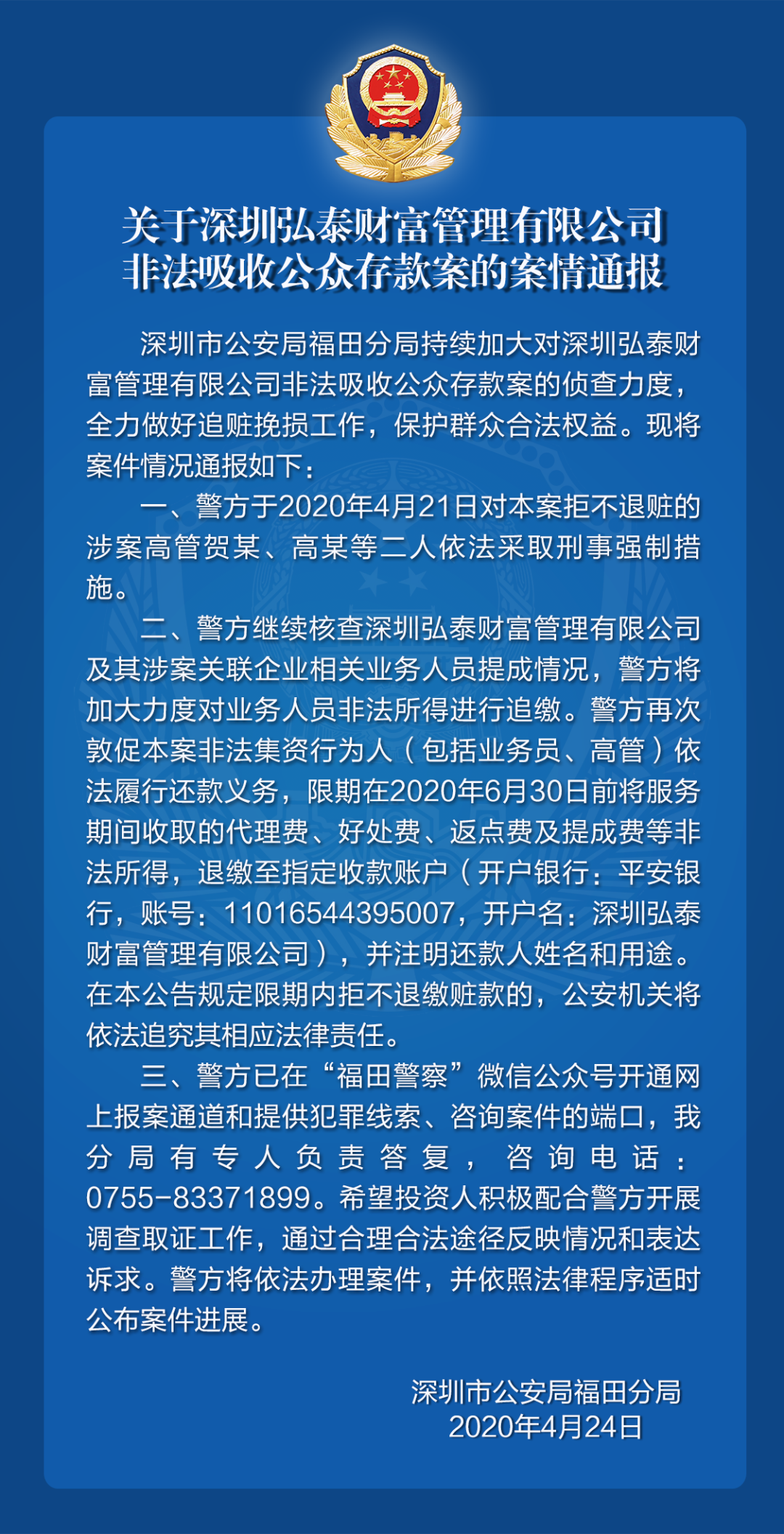 關(guān)于深圳弘泰財富管理有限公司非法吸收公眾存款案的案情通報