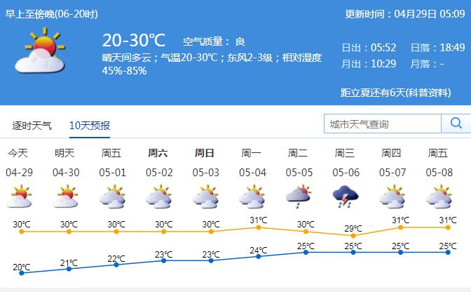見圳客戶端·深圳新聞網(wǎng)2020年4月29日訊 29日氣溫20-30℃,晴天間多云;東風(fēng)2-3級,相對濕度45%-85%。展望五一假期期間(1-5日)天氣總體平穩(wěn),多云間陰天,早晚有輕霧,間中有短時陣雨。