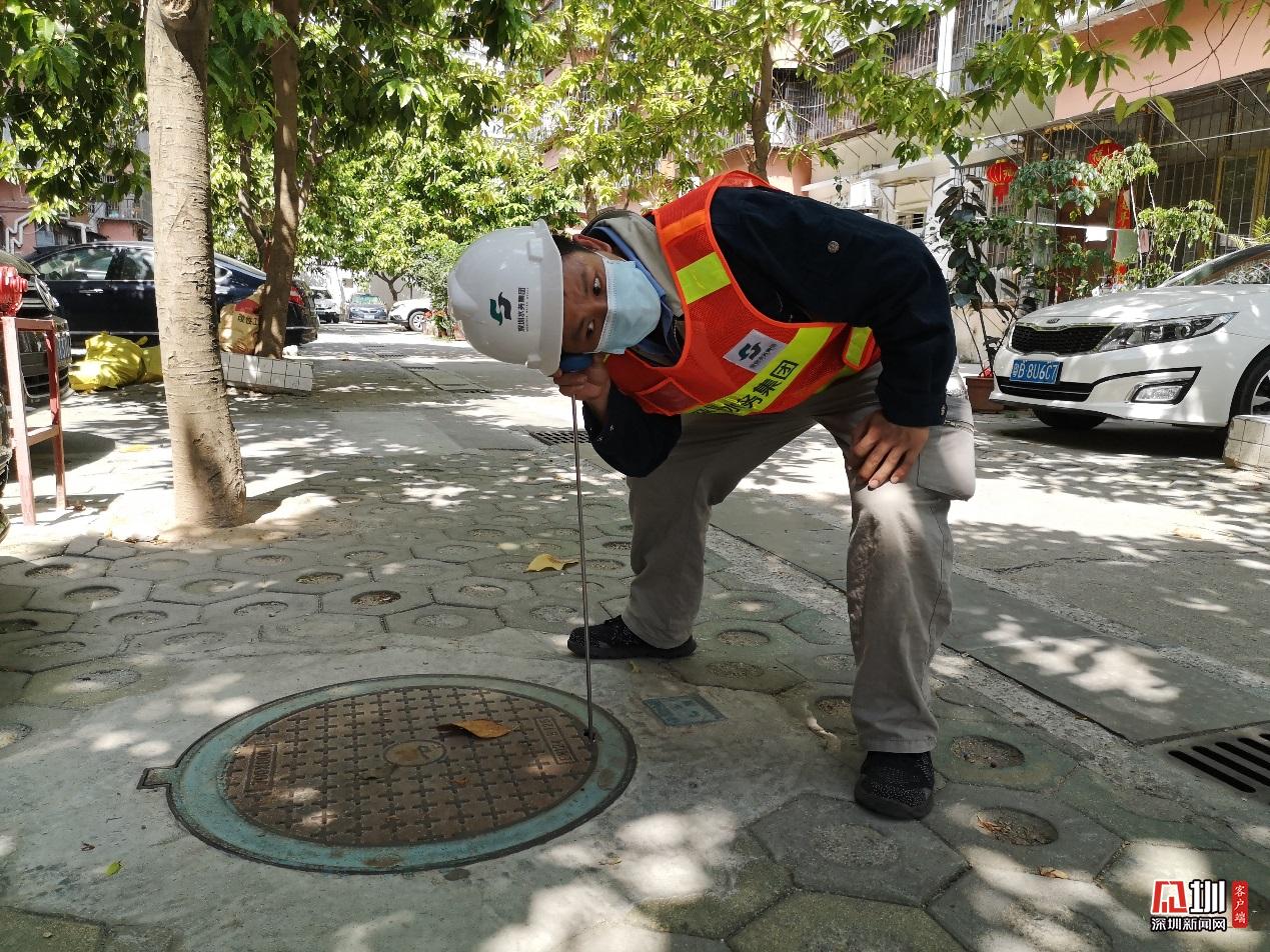 福田分公司員工殷海峰,正打開雨水篦子加速排水。