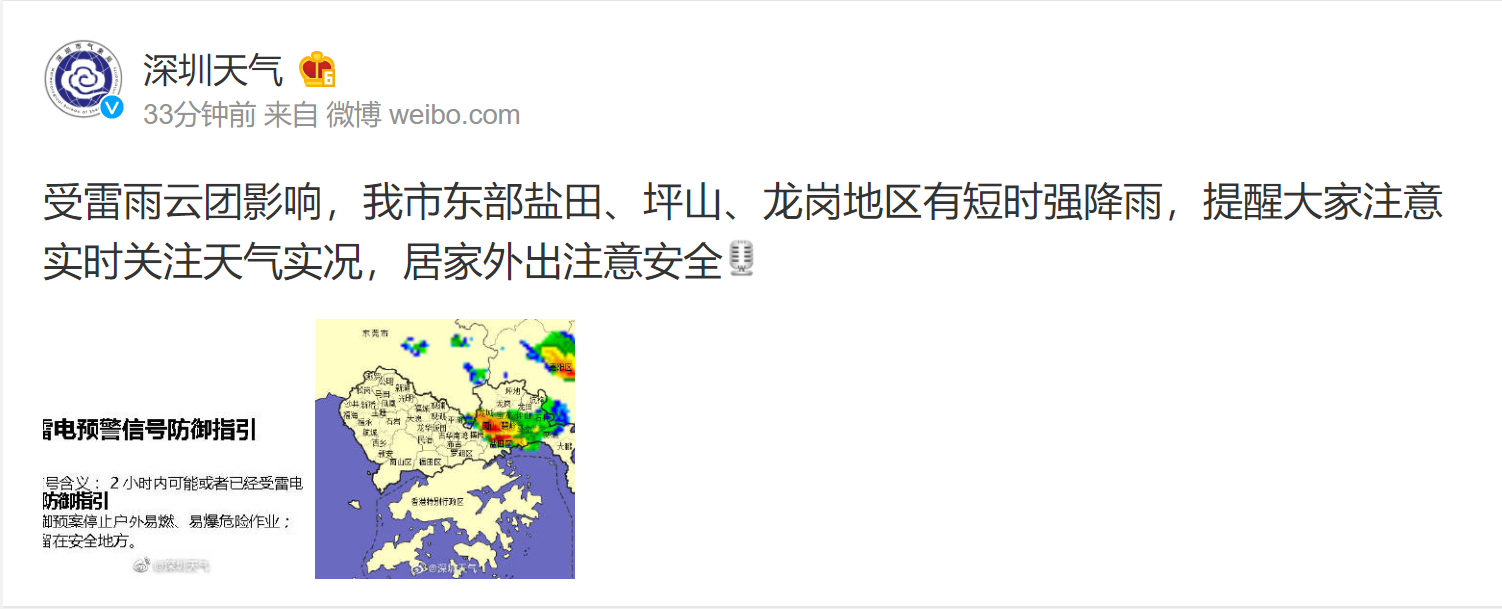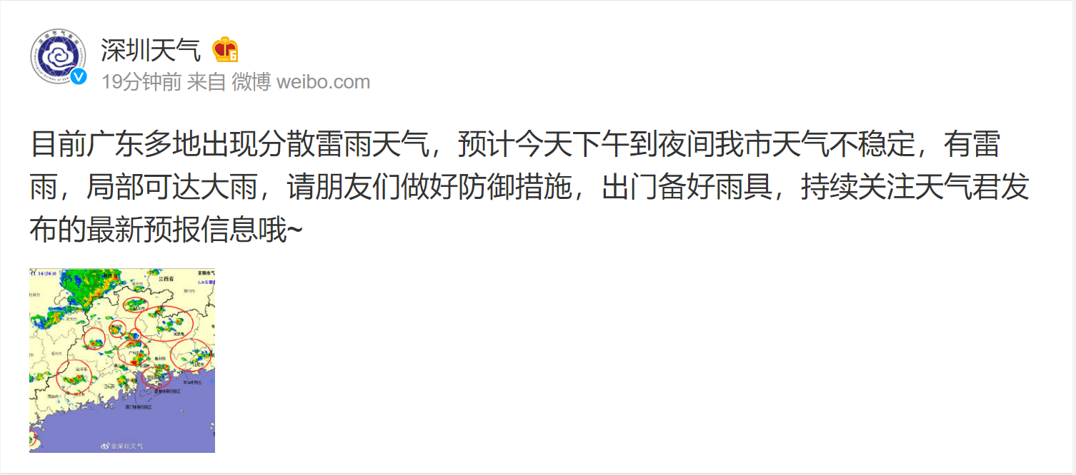 據(jù)@深圳天氣消息,目前廣東多地出現(xiàn)分散雷雨天氣,預(yù)計今天下午到夜間深圳天氣不穩(wěn)定,有雷雨,局部可達大雨,請大家做好防御措施,出門備好雨具,持續(xù)關(guān)注深圳天氣發(fā)布的最新預(yù)報信息。
