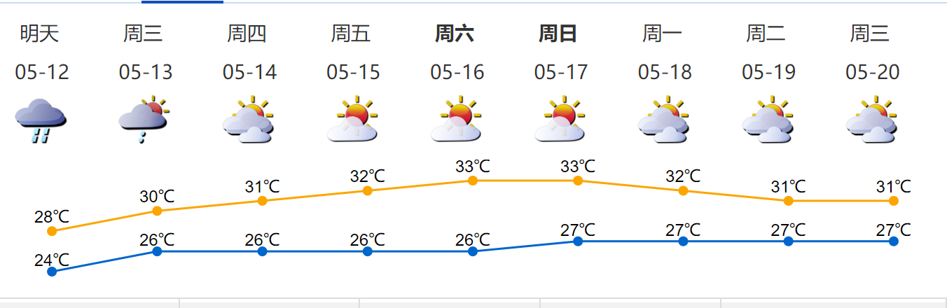 12日有雷陣雨,局部大雨,局部有短時陣雨;13日陣雨轉(zhuǎn)多云;14-17日多云到晴天,天氣再趨悶熱。