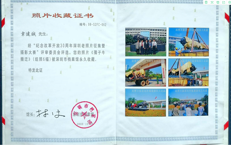 韋建誠拍攝的《孺子牛搬遷》組照被深圳市檔案館永久收藏。(攝影:韋建誠)
