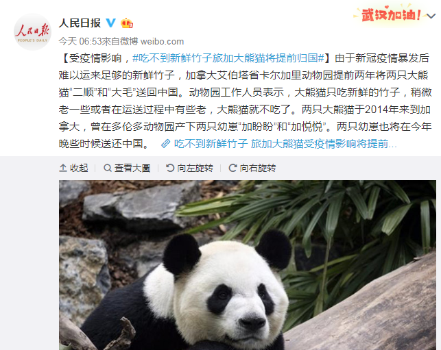 說(shuō)到國(guó)寶,2014年開(kāi)始旅居加拿大的兩只大熊貓“二順”和“大毛”要提前回國(guó)了。