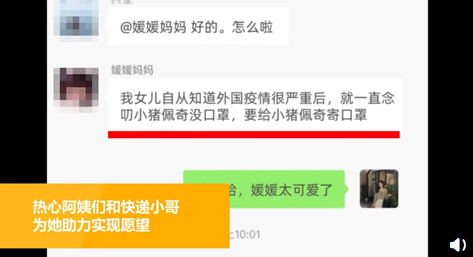 近日,三亞一小姑娘看到動(dòng)畫(huà)片里的小豬佩奇沒(méi)戴口罩特別著急,于是囑咐媽媽寄箱口罩給佩奇,還貼心地寫(xiě)了英文信囑咐它。