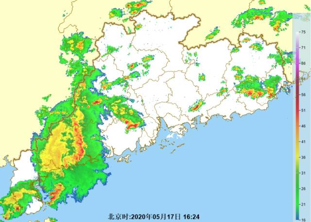 截至17日17時,雷達回波圖顯示,降雨已經(jīng)影響到茂名、陽江、江門、肇慶等地,正繼續(xù)向東移動,將于晚間影響珠三角、粵東等地。
