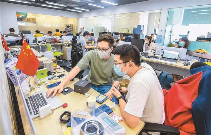 走進(jìn)工場,生機(jī)與活力撲面而來。位于19樓東南角的舒糖訊息科技(深圳)有限公司CEO何耀威,正在調(diào)試一款形似智能手表的血糖測試儀。這款通過最新的光譜技術(shù)及心電圖技術(shù),將血糖指數(shù)通過藍(lán)牙快速傳輸?shù)绞謾C(jī)上,實現(xiàn)無創(chuàng)監(jiān)測的儀器,如今正逐步投放市場。