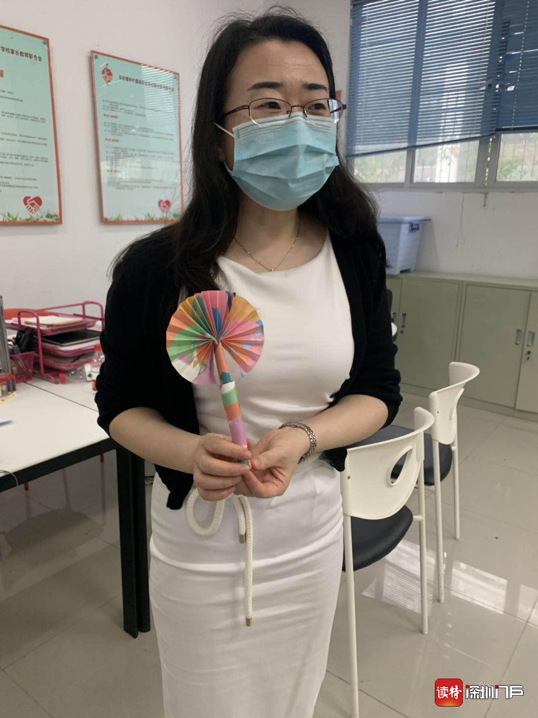 螺嶺外國語實驗學校三年級(12)班的學生林子軒專門為老師做了小折扇,一進校門就送到了老師手里,怕老師熱。