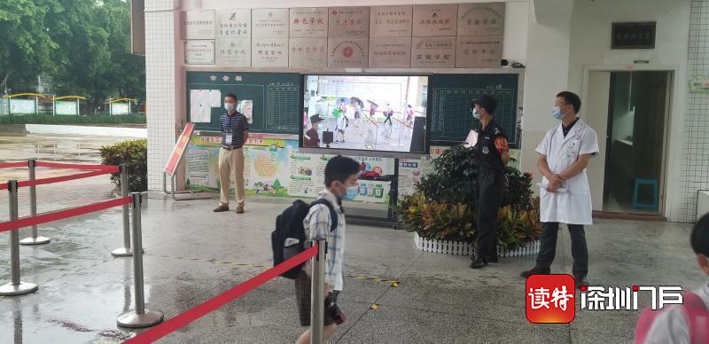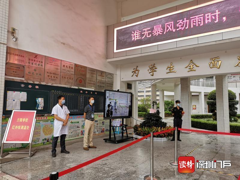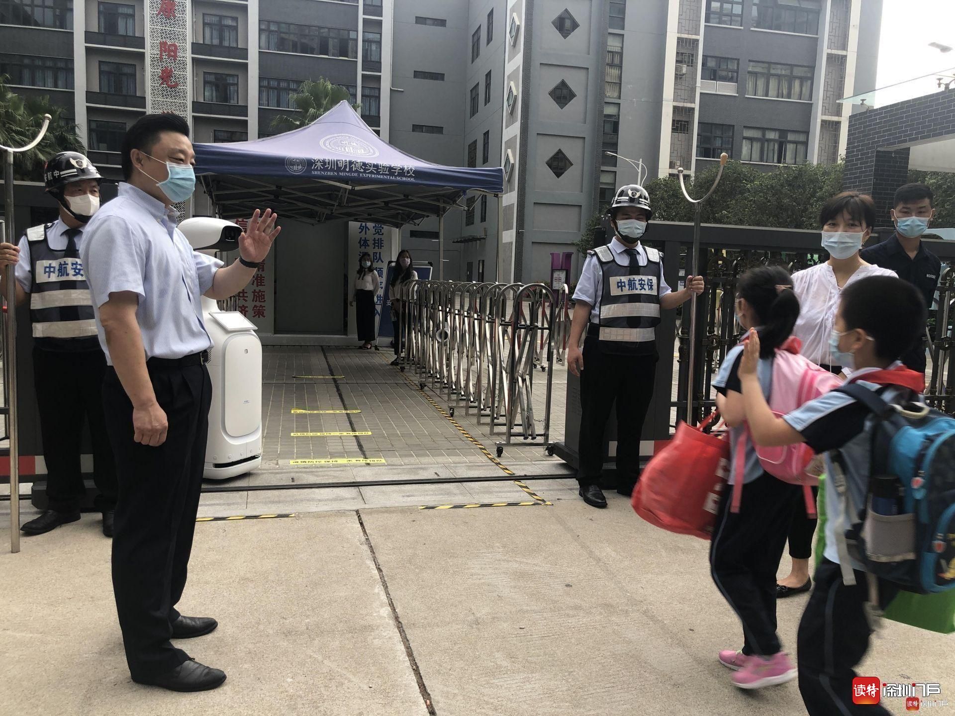 “同學們好!”“歡迎回來!”從7點起,明德實驗學校校長魯江與工作人員就在香蜜校區(qū)校門口迎候?qū)W生們,提醒孩子們戴好口罩,也與家長們交流返校事宜。校門口的一臺超氧水消殺機器人也在積極投入工作,工作人員在后臺控制面板可以監(jiān)測到入校人員的體溫情況。