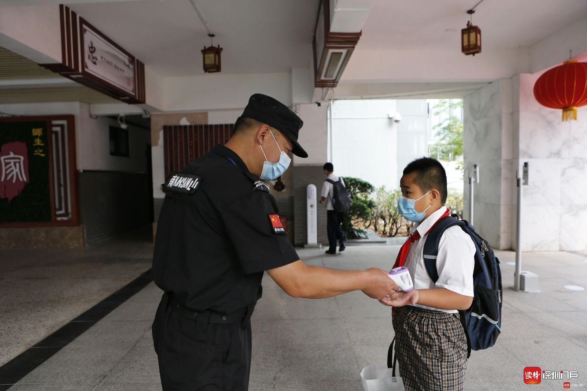 南山區(qū)科創(chuàng)學校,安保人員正在為返校的學生測量體溫。