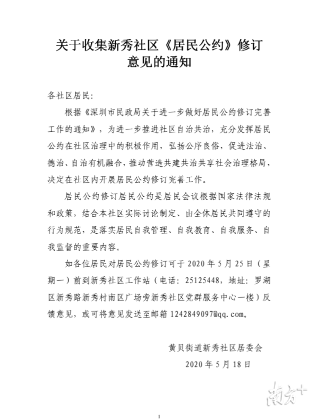 南方網(wǎng)2020年5月18日訊 垃圾分類、文明養(yǎng)犬、廣場舞不擾民……近日,一則社區(qū)居民公約征求意見稿貼在了深圳羅湖黃貝街道新秀社區(qū)的公告欄,成為居民們談?wù)摰臒衢T話題。