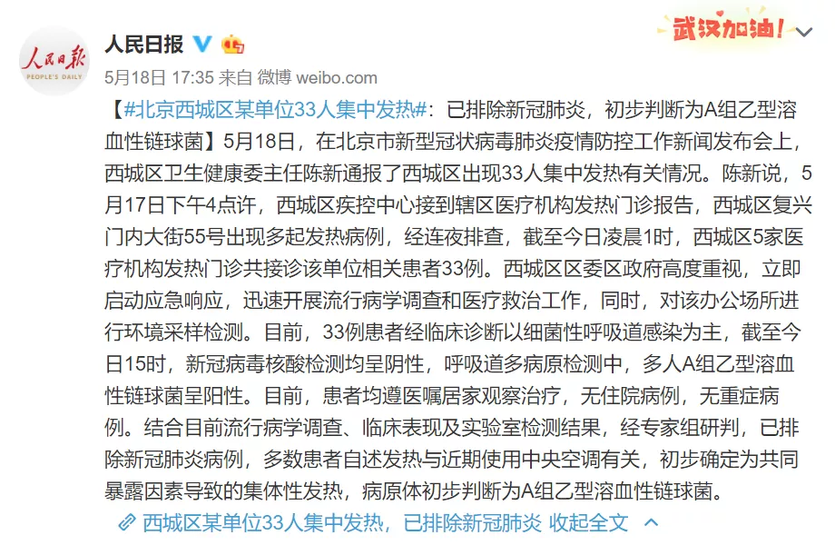 目前,33例患者經(jīng)臨床診斷以細(xì)菌性呼吸道感染為主,截至5月18日15時(shí),新冠病毒核酸檢測(cè)均呈陰性,呼吸道多病原檢測(cè)中,多人A組乙型溶血性鏈球菌呈陽(yáng)性。