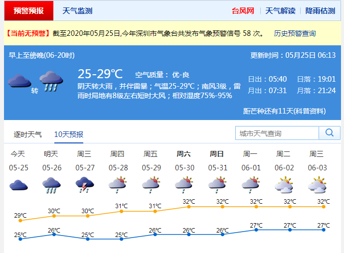 見圳客戶端·深圳新聞網(wǎng)2020年5月25日訊 連續(xù)陰雨雷暴,上周末的天氣趨于平靜,但是,新一波“龍舟水”馬上到貨!據(jù)深圳氣象臺消息,25-26日深圳有大雨到暴雨,并伴有雷暴和8級左右短時(shí)大風(fēng),降雨主要出現(xiàn)在25日中午至26日上午,26日午后降雨減弱;27-30日仍有陣雨或雷陣雨。