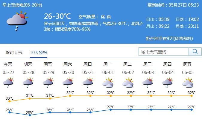 市氣象臺預測,27日-31日多云天氣為主,部分時間有陣雨或雷陣雨,氣溫逐日升高,天氣轉熱。27日多云間陰天,有陣雨或雷陣雨;氣溫26-30℃;北風2-3級;相對濕度70%-95%。28-31日多云,可見陽光,部分時間有(雷)陣雨。6月1-2日多云,局地有短時陣雨。