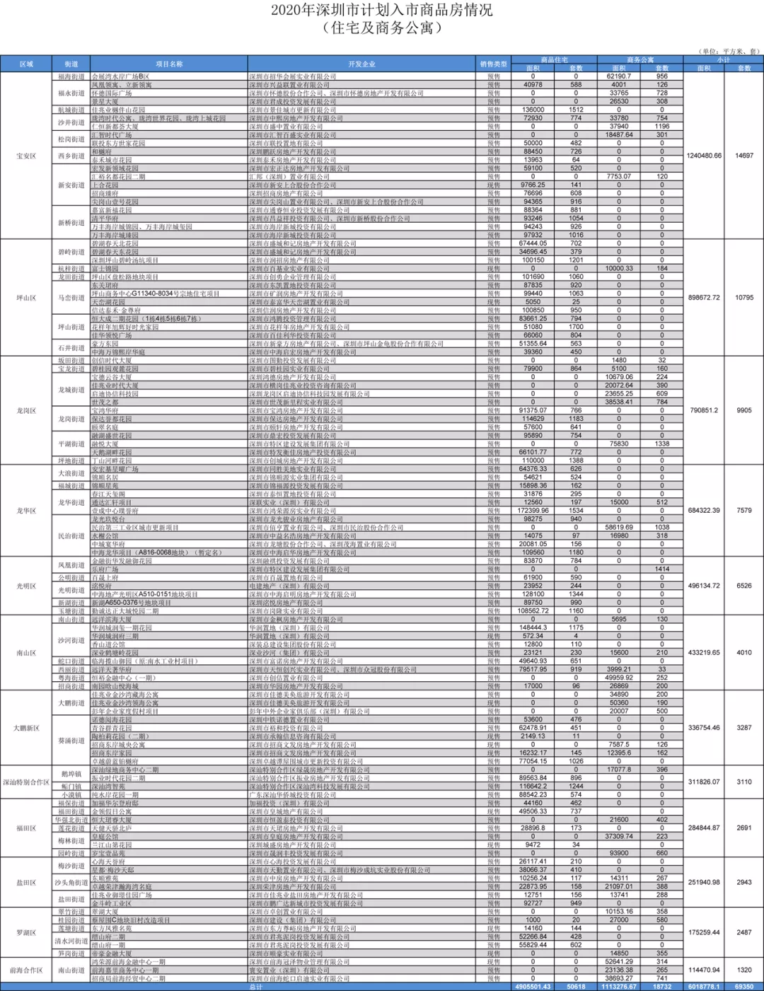 消息報(bào)記者在此次公布的《2020年深圳市計(jì)劃入市商品房情況 (住宅及商務(wù)公寓)》中看到,2020年南山區(qū)共有12個(gè)項(xiàng)目入市,累計(jì)供應(yīng)面積達(dá)到547690.59平米,供應(yīng)套數(shù)5330。