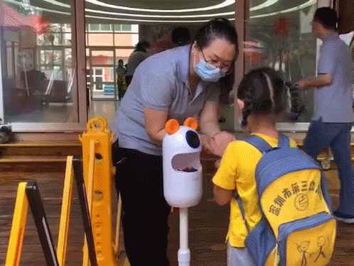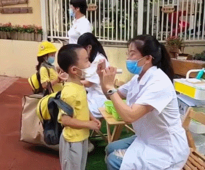 老師依次對(duì)孩子進(jìn)行體溫檢測(cè)
