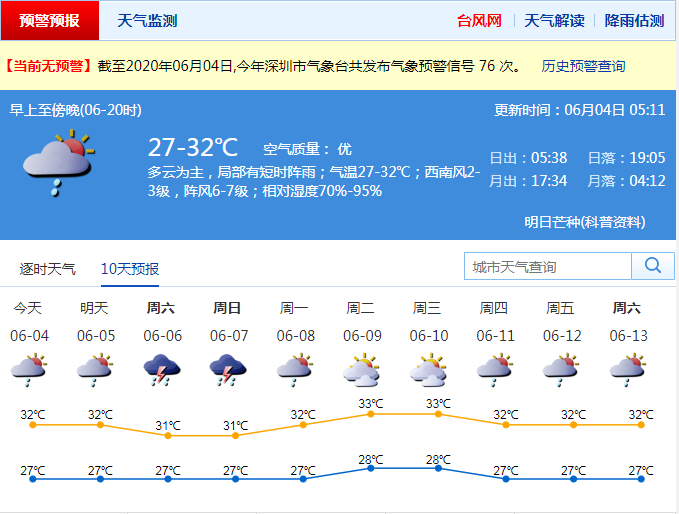 見圳客戶端·深圳新聞網(wǎng)2020年06月04日訊 深圳今日天氣多云為主,局部有短時陣雨;氣溫27-32℃;西南風2-3級,陣風6-7級;相對濕度70%-95%