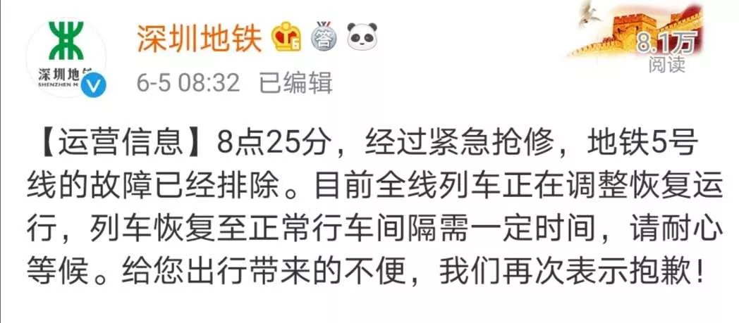 @深圳地鐵發(fā)布信息:8點(diǎn)25分,經(jīng)過緊急搶修地鐵5號(hào)線的故障已經(jīng)排除。目前全線列車正在調(diào)整恢復(fù)運(yùn)行。