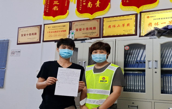 見(jiàn)圳客戶端·深圳新聞網(wǎng)2020年6月9日訊(深圳特區(qū)報(bào)記者 徐興東)6月9日早上,一位自稱劉先生的年輕人冒著滂沱大雨來(lái)到了西部公汽寶永車隊(duì)。一進(jìn)辦公室,劉先生雙手捧著將親筆寫(xiě)的一封感謝信呈給了隊(duì)助張喜鳳,并深有感觸地說(shuō)道:“多災(zāi)多難的父親有幸遇到乘務(wù)員鄭錄蓮的熱心幫助,并想方設(shè)法聯(lián)系上我。謝謝你們的成全,才讓我在父親節(jié)即將到來(lái)之時(shí)還能叫一聲爸爸,我將終生銘記諸位的大恩大德!”樸實(shí)無(wú)華的話語(yǔ),感染了在場(chǎng)的每一個(gè)人,分明看出個(gè)個(gè)眼里都閃爍著晶瑩的喜悅淚花。
