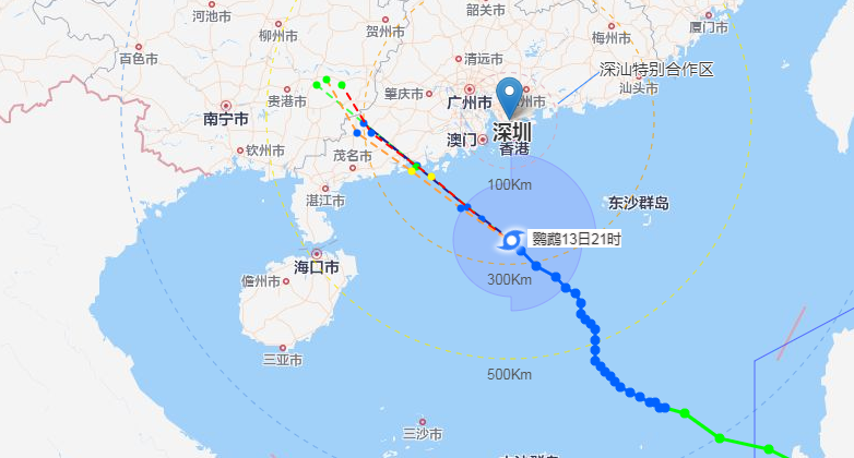 13日19時,臺風“鸚鵡”(熱帶風暴級)的中心位于深圳偏南方約272公里的南海海面上,中心最大風力9級(23米/秒),向西偏北方向移動,強度逐漸加強,預計14日上午在江門至茂名一帶登陸,將給深圳帶來明顯風雨影響,成為今年首個影響深圳的臺風。