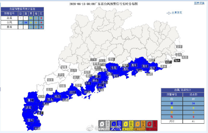 深圳市氣象臺于2020年06月13日07時15分將全市臺風白色預警升級為藍色,預計受“鸚鵡”影響,今天傍晚起風力逐漸加大,深圳市陣風達8級以上,全市進入臺風戒備狀態(tài),落實各項防風措施,及時組織戶外、高空、港口及海上作業(yè)人員做好防御工作。