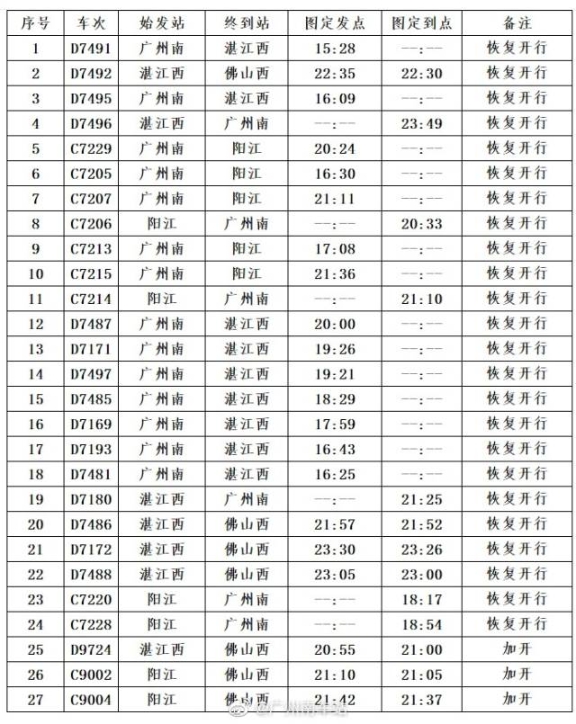 其中,廣州南站恢復開行列車24趟,其中始發(fā)列車14趟,跨線列車4趟,終到列車6趟;同時加開跨線列車3趟,恢復開行和加開列車共計27趟。