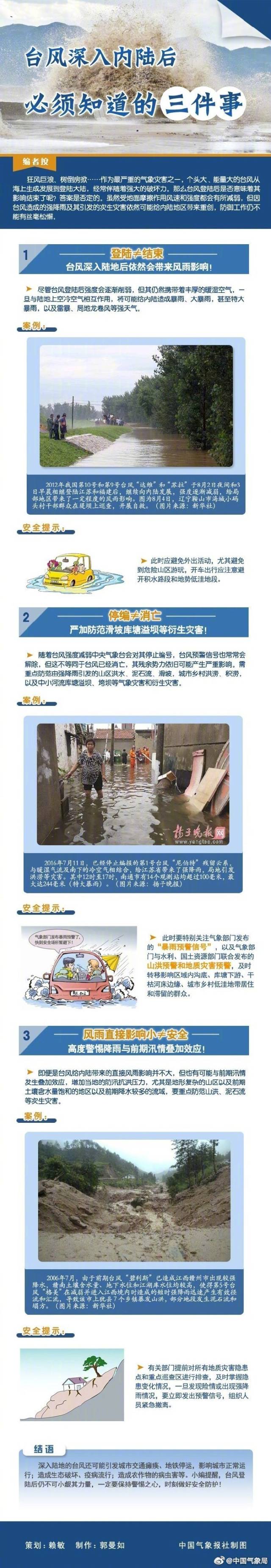 3、風雨直接影響小不等于安全。即便臺風給內陸帶來的直接風雨影響不大,但可能與前期汛情疊加,產生泥石流等次生災害。