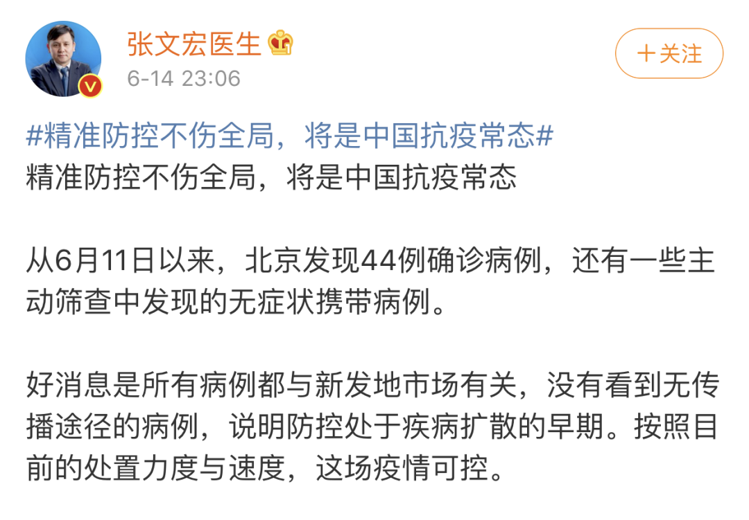 6月14日,張文宏醫(yī)生在微博上發(fā)布了名為《精準(zhǔn)防控不傷全局,將是中國抗疫常態(tài)》的文章,針對(duì)北京近日新發(fā)的新冠疫情,他是這么說的: