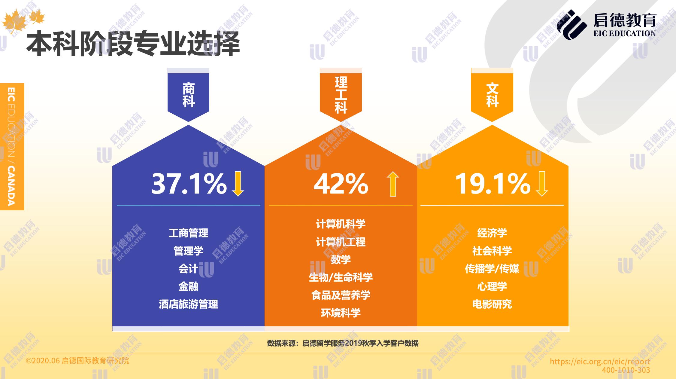 啟德留學(xué)服務(wù)2019秋季入學(xué)客戶數(shù)據(jù)顯示,在本科階段專業(yè)選擇理工科占比42%,商科占比37.1 %,文科19.1%,理工科的申請人數(shù)超過了商科。碩士階段選擇最多的專業(yè)是 MBA、教育學(xué)和計算機,其他新興的跨學(xué)科專業(yè)包括滑鐵盧大學(xué)的數(shù)字科學(xué)與人工智能碩士,滑鐵盧大學(xué)的 MBET (商業(yè)、創(chuàng)業(yè)和技術(shù)專業(yè)),與麥克馬斯特大學(xué)的 MEEI (工程、創(chuàng)業(yè)與創(chuàng)新專業(yè))。