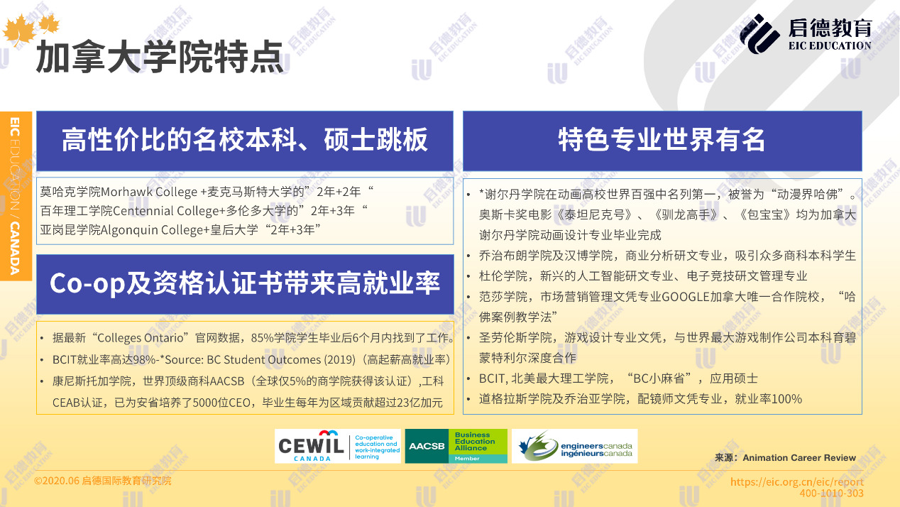 據(jù)最新“ Colleges Ontario”官網(wǎng)數(shù)據(jù),85 %的學(xué)院學(xué)生畢業(yè)后6個月內(nèi)找到了工作,91%的雇主對學(xué)生表示非常滿意。如康尼斯托加學(xué)院,擁有世界頂級商科 AACSB與工科 CEAB認證,為安省培養(yǎng)了5000位 CEO,畢業(yè)生每年為區(qū)域貢獻超過23億加元。而奧斯卡獎電影《泰坦尼克號》、《馴龍高手》、《包寶寶》均為加拿大謝爾丹學(xué)院動畫設(shè)計專業(yè)畢業(yè)完成。北阿伯塔學(xué)院的納米技術(shù)專業(yè),杜倫學(xué)院的人工智能專業(yè),道格拉斯學(xué)院的配鏡師專業(yè),范莎學(xué)院的飛機維修專業(yè)也是世界有名的特色專業(yè)。