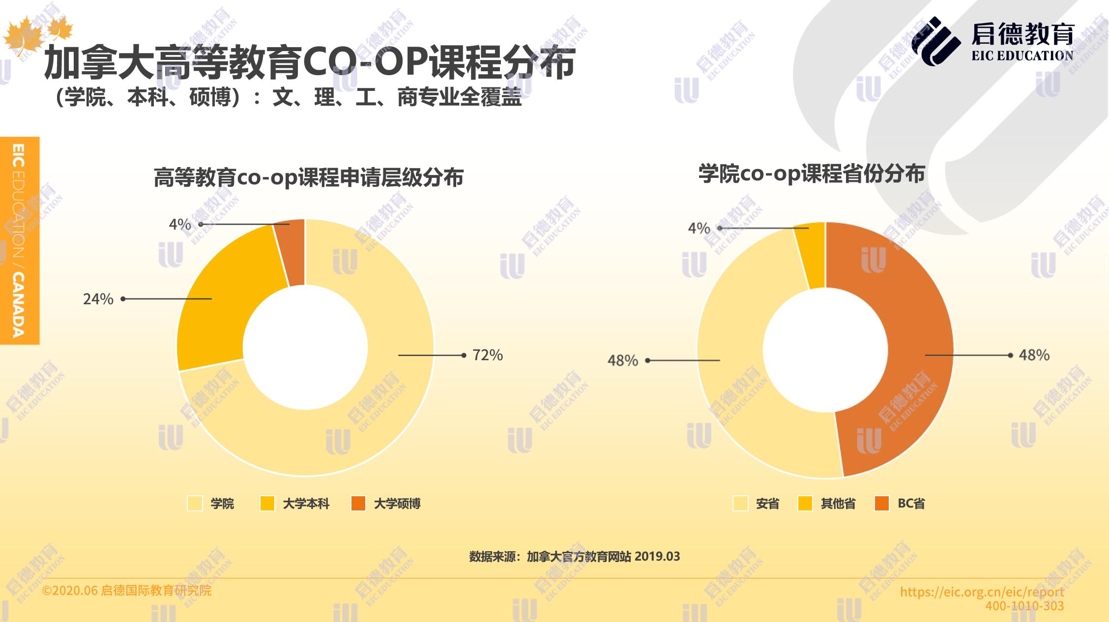 加拿大官方教育網(wǎng)站數(shù)據(jù)顯示,加拿大高等教育普遍開設(shè)覆蓋文、工、理、商全專業(yè)的 Co - op帶薪實習課程,其中學(xué)院的 Co - op課程占比最多(72% ),其次是大學(xué)本科(24% )與大學(xué)碩博(4% )。在學(xué)院 Co - op課程的省份分布上,安大略省與英屬哥倫比亞省平分秋色,各占48%。