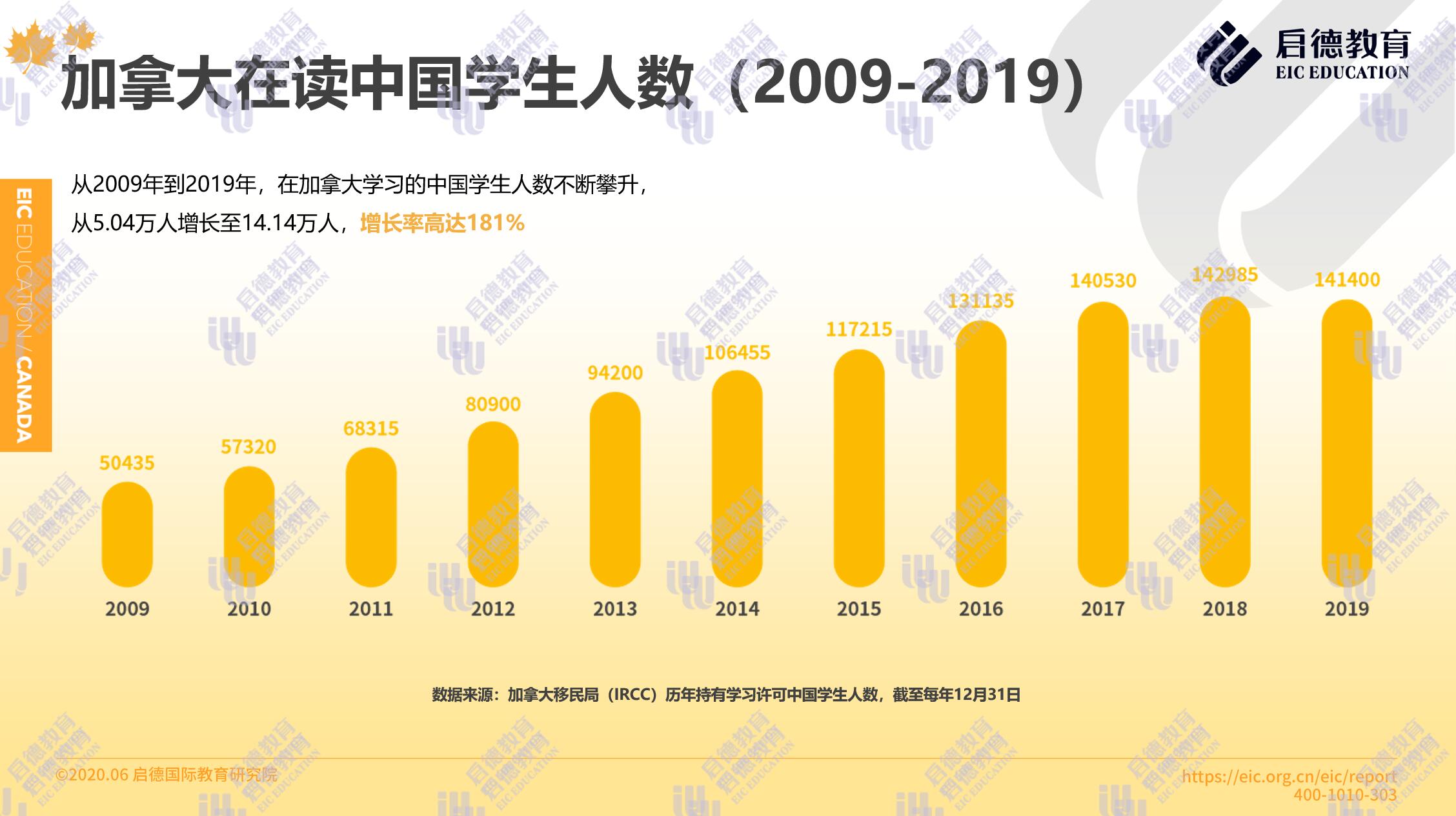 一直以來,加拿大都是中國學(xué)生四大熱門留學(xué)目的地之一。對于中國意向留學(xué)生來說,加拿大擁有教育質(zhì)量高、留學(xué)選擇靈活豐富、性價比高等優(yōu)勢。加拿大移民局( Immigration, Refugees and Citizenship Canada )公布的學(xué)習許可持有者數(shù)據(jù)顯示,2019年度約有14.14萬中國學(xué)生在加拿大留學(xué),占加拿大全部國際留學(xué)生的22.1%。中國學(xué)生人數(shù)從2009年的5.04萬人增長至2019年的14.14萬人,增長率高達181%。