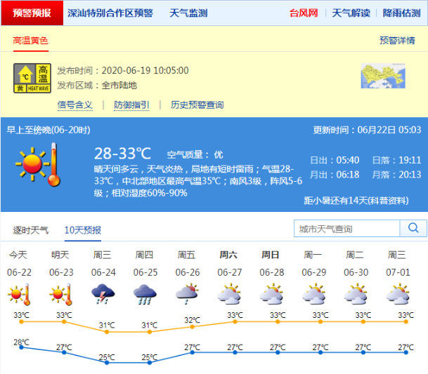 見圳客戶端?深圳新聞網(wǎng)2020年6月22日訊 據(jù)深圳氣象局消息,6月22日,深圳晴天間多云,天氣炎熱,局地有短時(shí)雷雨;氣溫28-33℃,中北部地區(qū)最高氣溫35℃;南風(fēng)3級,陣風(fēng)5-6級;相對濕度60%-90%。