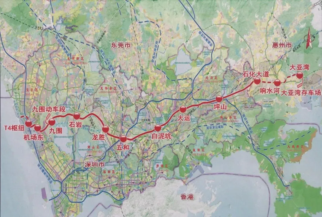 龍崗至大鵬支線:起自龍崗,經(jīng)坪山至大鵬新區(qū),線路與深惠城際、深大城際銜接。