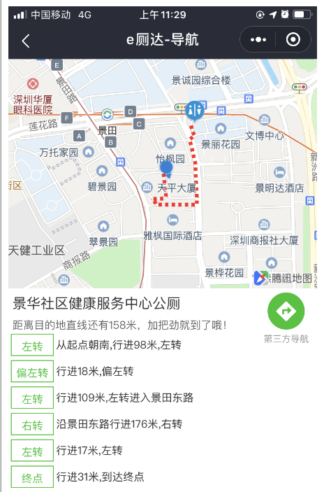 第三個功能為導航找?guī)?。既然已?jīng)查看到周邊有廁所分布,怎能不知道具體線路呢?“e廁達”中的“帶我去”按鈕可以輕松引領你去往定位的公廁。