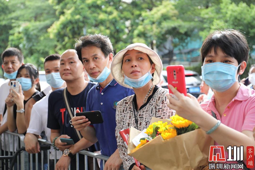 深圳高級(jí)中學(xué)考點(diǎn)外家長(zhǎng)翹首以盼,等待考生走出考場(chǎng)。