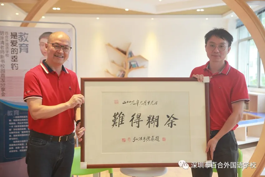 最后,朱正興校長給胡涂清老師贈送了一幅書法匾額作為“賀禮”,上面寫著“難得糊涂”。同時,朱校長也分享了自己的閱讀心得:“特別感謝胡老師,這是百外自成立以來第一位把自己的教育心路歷程以文字的形式集中展示給大家的老師,胡老師是我們的驕傲,也是我們學習的榜樣,是百外教育工作者的寫照縮影!胡老師對教育的堅守,對夢想的執(zhí)著追求,在重復輪回的工作中,做著統(tǒng)一卻又與眾不同的事,做成了教育詩歌,做成了教育散文。胡老師安靜卻不安分,清醒中保持一份糊涂,幾分激情,更有滿懷的豁達……”