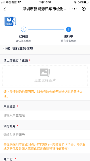 客戶需上傳銀行卡照片,并填寫銀行賬號、開戶行信息。開戶行如不在選項范圍內可選擇“其他”自填。其中,銀行賬號需為深圳市營業(yè)網點開戶的銀行一類儲蓄卡,華僑、港澳臺地區(qū)居民及外國人需提供深圳市建設銀行一類儲蓄卡。
