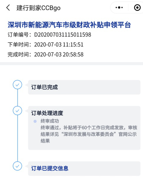 客戶可通過i深圳微信公眾號、深圳市發(fā)展和改革委員會官方網站或微信公眾號、深圳交警微信公眾號或建行到家CCBgo小程序登錄“深圳市新能源汽車市級財政補貼申領”平臺。