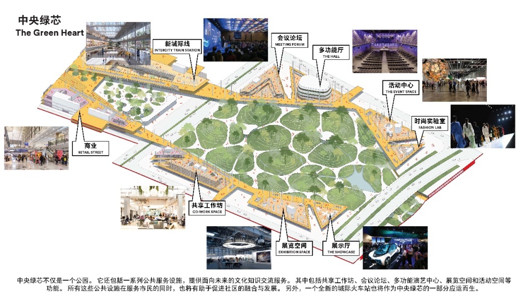 方案以獨特的“綠鏈都芯”為理念,打造一個耦合生態(tài)、交通和公共生活的超級樞紐。設計的中央綠芯引入大面積森林和草甸,使人們在城市中重遇自然,讓北站樞紐地區(qū)既擁有大城市商務中心區(qū)的特質(zhì),也擁有郊外自然的品質(zhì),形成全新的都市生活體驗。同時,中央綠芯還包括會議論壇、多功能演藝中心等一系列公共服務設施,提供面向未來的文化知識交流服務。