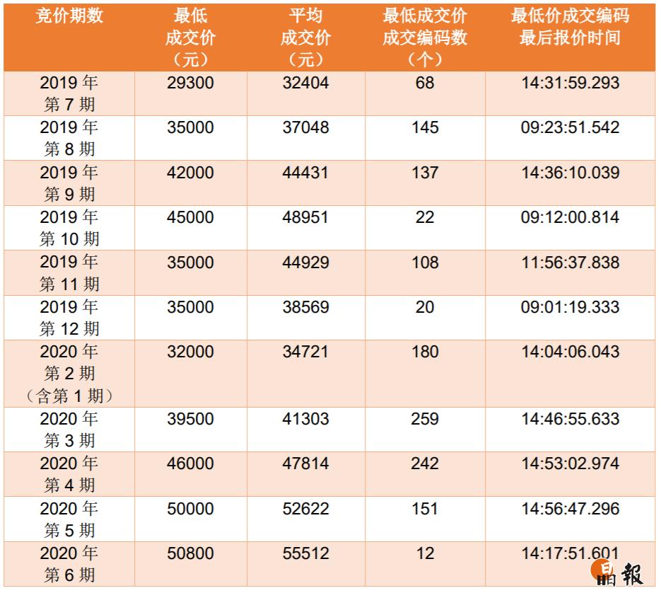 7月15日,2020年第7期普通小汽車增量指標(biāo)競價(jià)公告發(fā)布,本期普通小汽車增量指標(biāo)共3346個(gè),其中個(gè)人指標(biāo)2945個(gè)。競價(jià)時(shí)間定為7月27日9:00至15:00,連續(xù)進(jìn)行6個(gè)小時(shí),單位和個(gè)人在同一時(shí)間分別對相應(yīng)增量指標(biāo)進(jìn)行競價(jià)。此前,第5期、第6期個(gè)人最低成交價(jià)均破5萬,創(chuàng)近一年新高。