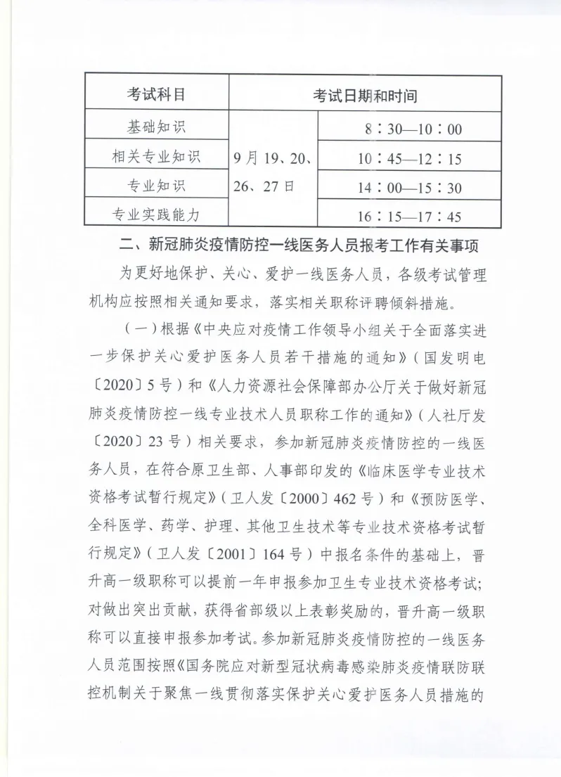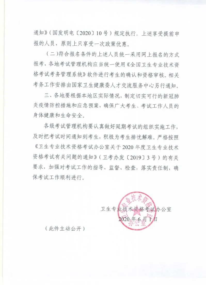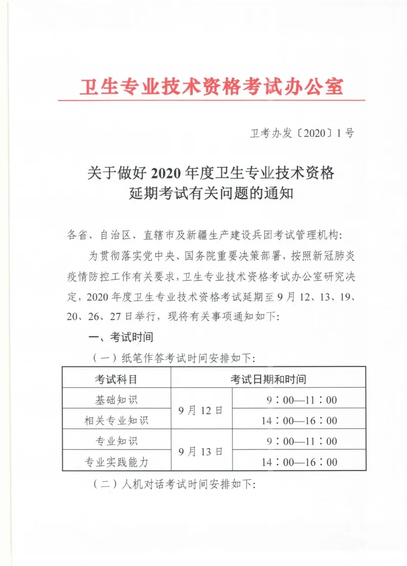 6月1日,衛(wèi)生專(zhuān)業(yè)技術(shù)資格考試辦公室印發(fā)《關(guān)于做好2020年度衛(wèi)生專(zhuān)業(yè)技術(shù)資格延期考試有關(guān)問(wèn)題的通知》,2020年度衛(wèi)生專(zhuān)業(yè)技術(shù)資格考試延期至9月12、13、19、20、26、27日舉行。