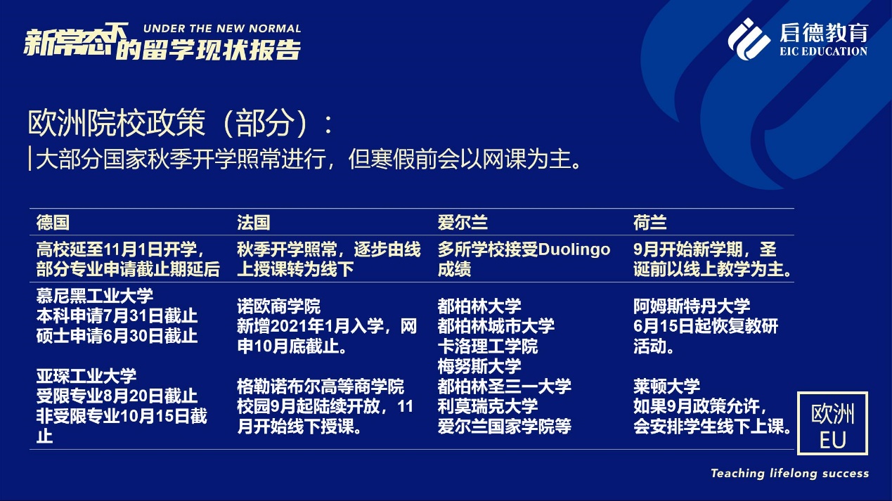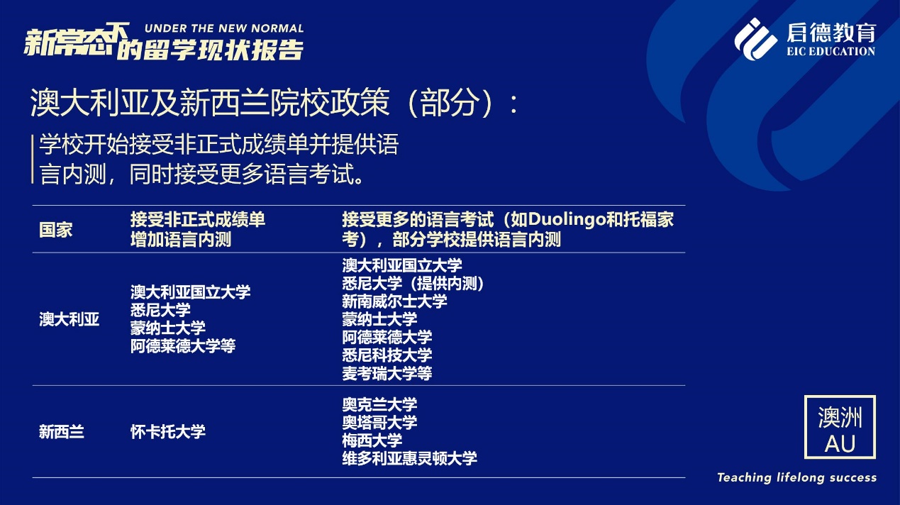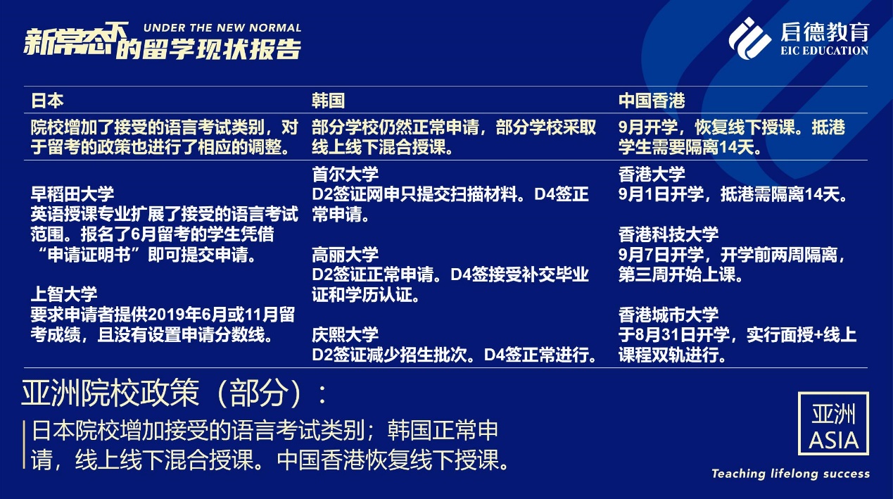 《報(bào)告》也梳理了近期各主要留學(xué)目的國(guó)及院校針對(duì)國(guó)際學(xué)生出臺(tái)的各類政策。據(jù)啟德留學(xué)英愛(ài)項(xiàng)目總監(jiān)孫波介紹,國(guó)內(nèi)英國(guó)簽證中心已經(jīng)重新開(kāi)放。準(zhǔn)備赴英讀研的學(xué)生,部分大學(xué)明確表示秋季可以正常開(kāi)學(xué),大課將會(huì)采用線上授課的方式,小班授課線下進(jìn)行;還有部分大學(xué)向?qū)W生提供更加靈活的入讀方案,學(xué)生可以選擇9月入讀或者1月入讀。此外,從2021年開(kāi)始,在英國(guó)完成博士學(xué)位的國(guó)際學(xué)生將會(huì)獲得3年有效期的 PSW工作簽證,本科生和碩士生可以獲得2年有效期的 PSW工作簽證。