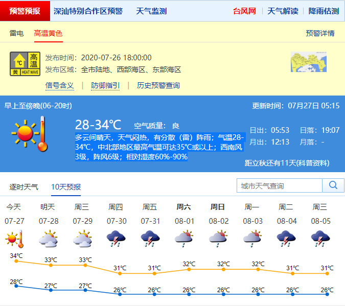 見圳客戶端?深圳新聞網(wǎng)2020年7月27日訊 根據(jù)深圳氣象局官方消息,深圳7月27日白天多云間晴天,天氣悶熱,有分散(雷)陣雨;氣溫28-34℃,中北部地區(qū)最高氣溫可達(dá)35℃或以上;西南風(fēng)3級,陣風(fēng)6級;相對濕度60%-90%。