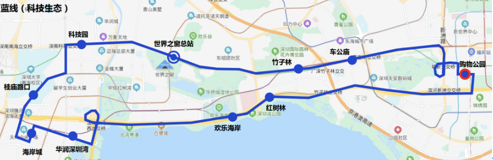 ??空军c(diǎn):世界之窗總站→竹子林→車公廟→購(gòu)物公園→紅樹林→歡樂海岸→華潤(rùn)深圳灣→海岸城→深大-騰訊站→科技園→世界之窗總站