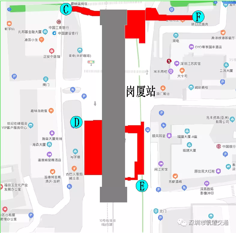 崗廈站沿規(guī)劃彩田路敷設(shè),車站為地下三層島式站臺(tái)鋼筋混凝土箱形框架結(jié)構(gòu)。該站共設(shè)出入口4個(gè):E口、F口、C口、D口。