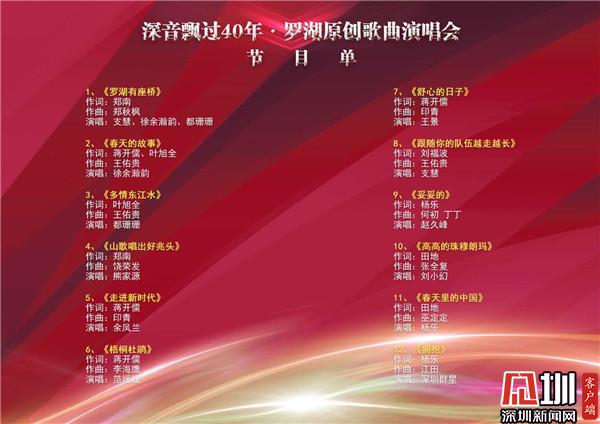 歌曲創(chuàng)作是深圳市羅湖區(qū)的強(qiáng)項(xiàng),中國(guó)大陸的流行歌曲即由此發(fā)端。四十年來(lái),《春天的故事》、《走進(jìn)新時(shí)代》、《跟隨你的隊(duì)伍越走越長(zhǎng)》、《山歌唱出好兆頭》等一大批膾炙人口的羅湖原創(chuàng)歌曲,經(jīng)由影視、廣播等媒體傳播,風(fēng)靡大江南北,反映了時(shí)代劇變,表達(dá)了人民心聲。此次演唱會(huì),精選了其中的12首歌曲,由熊家源、余鳳蘭、劉小幻、范媛媛、楊樂(lè)、支慧、趙久峰、都園園、王景、徐余瀚韻等數(shù)位深圳歌唱家傾情演繹,其中既有創(chuàng)作于上世紀(jì)的歌曲,也有近年來(lái)新創(chuàng)作的歌曲,堪稱(chēng)一場(chǎng)聲樂(lè)盛宴。